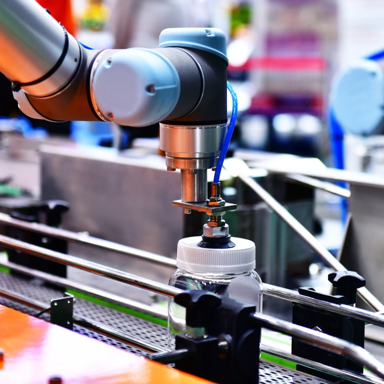 Robot arm arranged glass water bottle on Automatic industrial machinery equipment at industrial