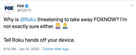 “We have tried for months to get Fox to sign an agreement and we offered Fox an extension but they declined,” Roku said in a blog post Friday afternoon about the then-unresolved dispute. “If an agreement is not reached, we will be forced to remove Fox channels from the Roku platform because we can’t distribute content without an agreement.”