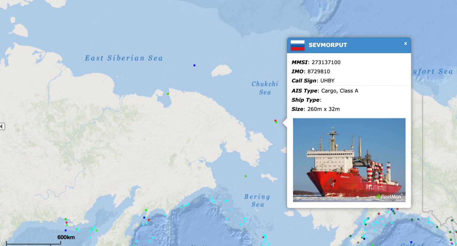 The 260 meter long nuclear-powered vessel early this week sailed thought the Bering Strait and into the Chukchi Sea. A thick layer of sea-ice covers the remote waters that mark the eastern end of the Northern Sea Route.