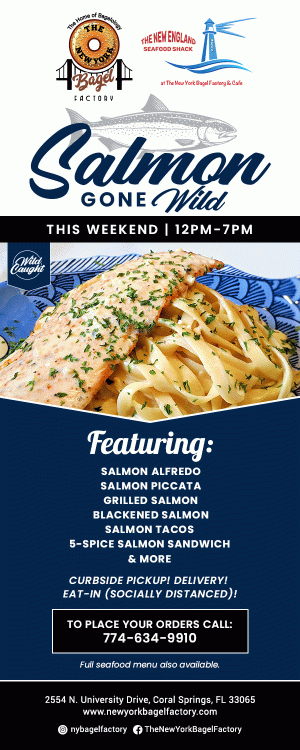 It’s a Salmon seafood spectacular at NY Bagel Factory and New England Seafood Shack. The salmon is wild, wild caught that is, and there are so many options to choose from. Enjoy dishes like Salmon Alfredo, Salmon Piccata, Grilled Salmon, Blackened Salmon, Salmon Tacos, 5-Spice Salmon Sandwich, and so much more. Don’t forget dessert! Indulge in the made-fresh Homemade Chocolate Chip Bread Pudding.