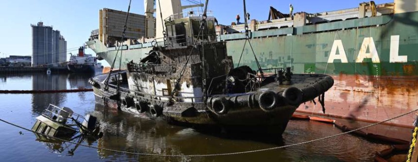 Salvors raise wreck of tug that sank after being struck by cargo ship in Devonport, Australia