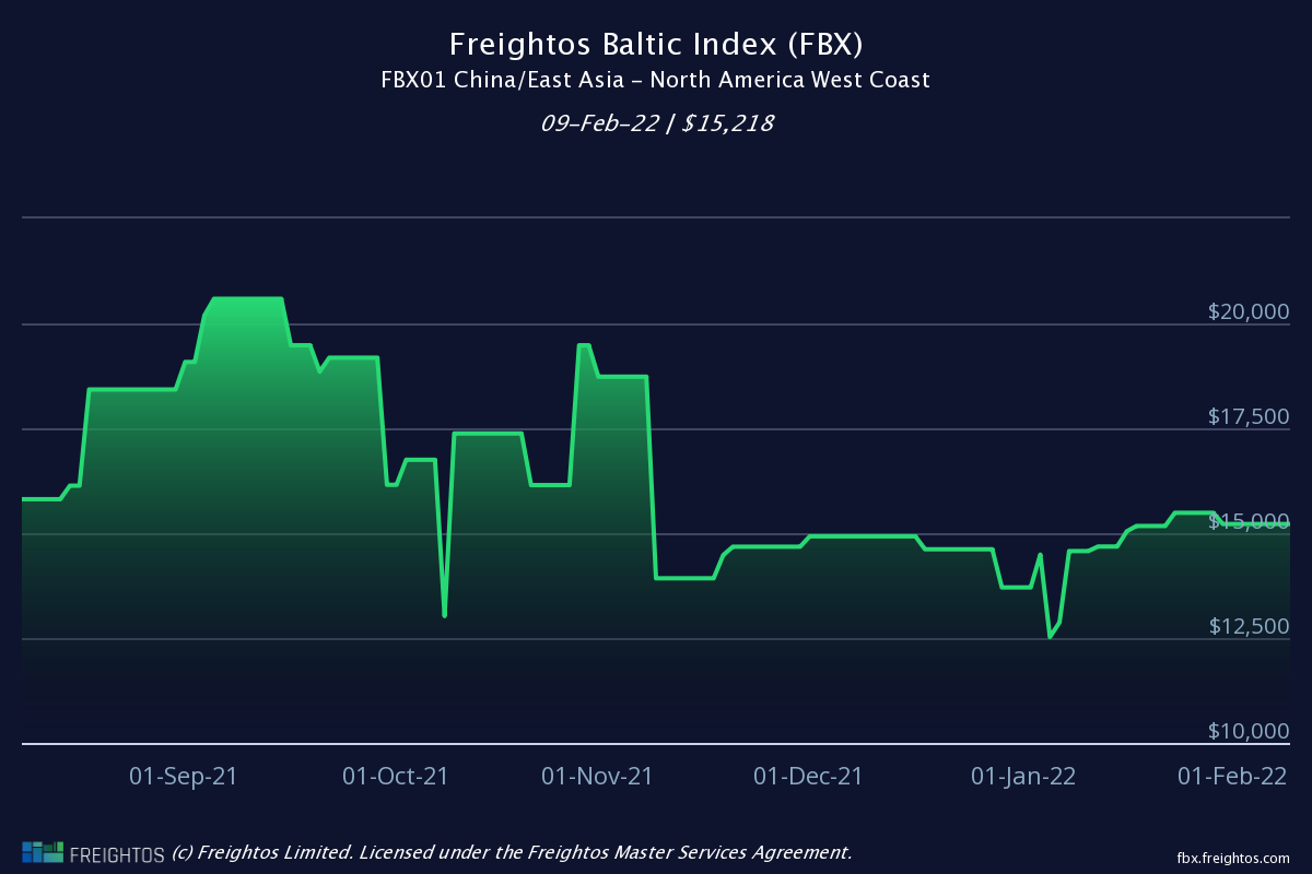 Asia-US West Coast prices were steady at $15,218/FEU as on February 9, according to data from Freightos. The rate is 182 percent higher than the same time last year.