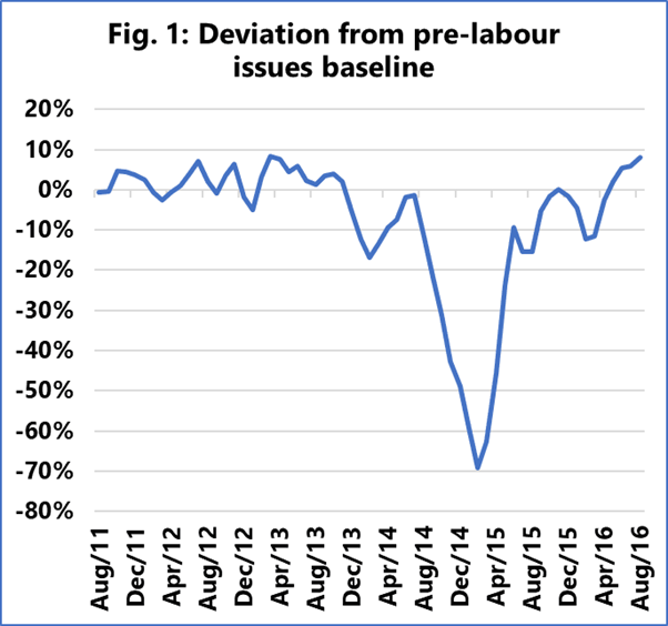 “As can be seen in Figure 1, the peak impact of the labour dispute was felt in February 2015 with reliability 70 percentage points below the baseline. Following the resolution of the dispute on February 20, it took 8-9 months for reliability to get back to the baseline. Even when we adjust for the seasonal impact of Chinese New Year, there is no material difference to the picture.”