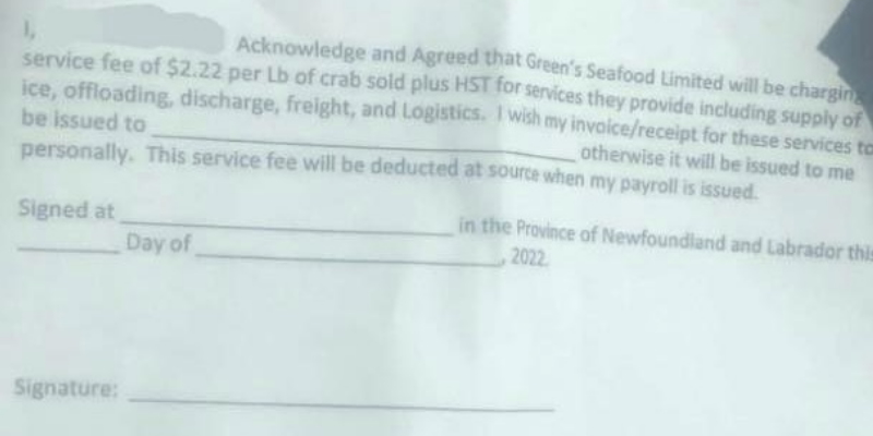 A fishing industry advocate was surprised to learn from harvesters that at least one major seafood producer in the province is asking crab harvesters to sign a document before leaving the wharf agreeing to a “service fee” of $2.22 a pound.