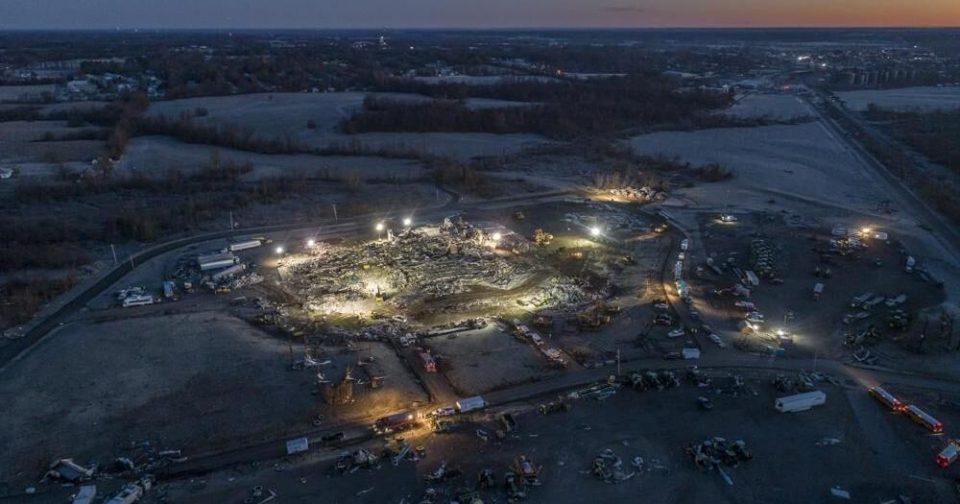 Search are rescue crews work at the Mayfield Consumer Products candle factory early Sunday, Dec. 12, 2021 in Mayfield, Ky. Tornadoes and severe weather caused catastrophic damage across multiple states Friday, killing several people overnight. (Ryan C. Hermens/Lexington Herald-Leader via AP)