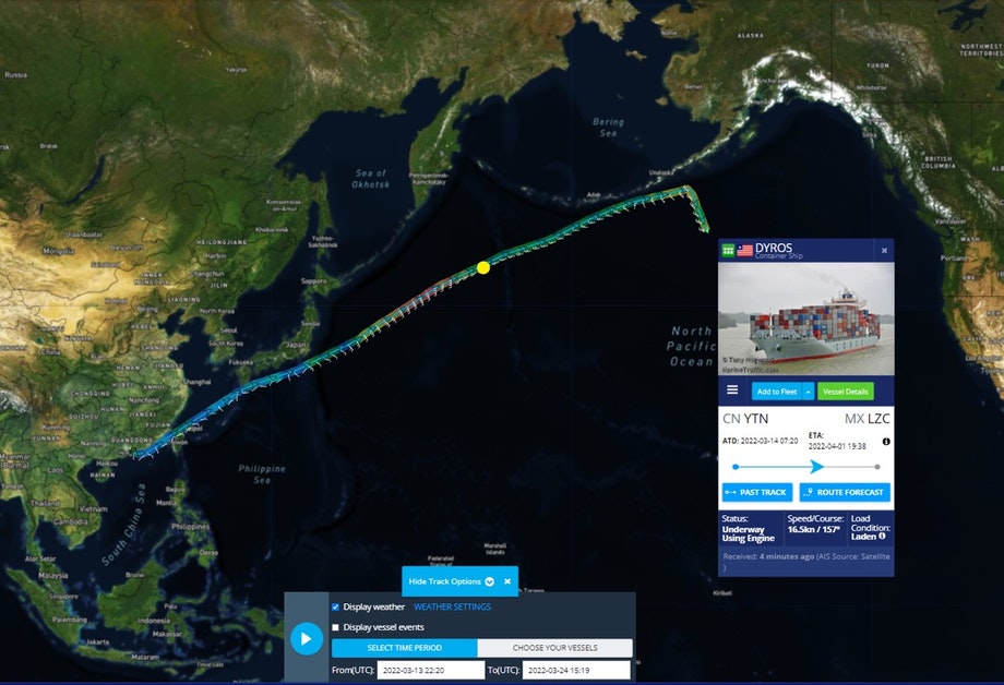 According to MarineTraffic, the Dyros continued east for more than 1,000 miles after the spill, then made a sharp turn to starboard after nearing Unalaska Island, home of the Port of Dutch Harbor.