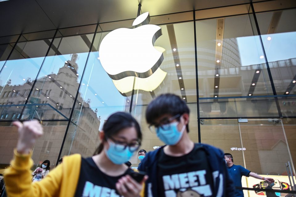People wearing face masks look at a cellphone outside an Apple store during a May Day holiday in Shanghai on May 1, 2020.