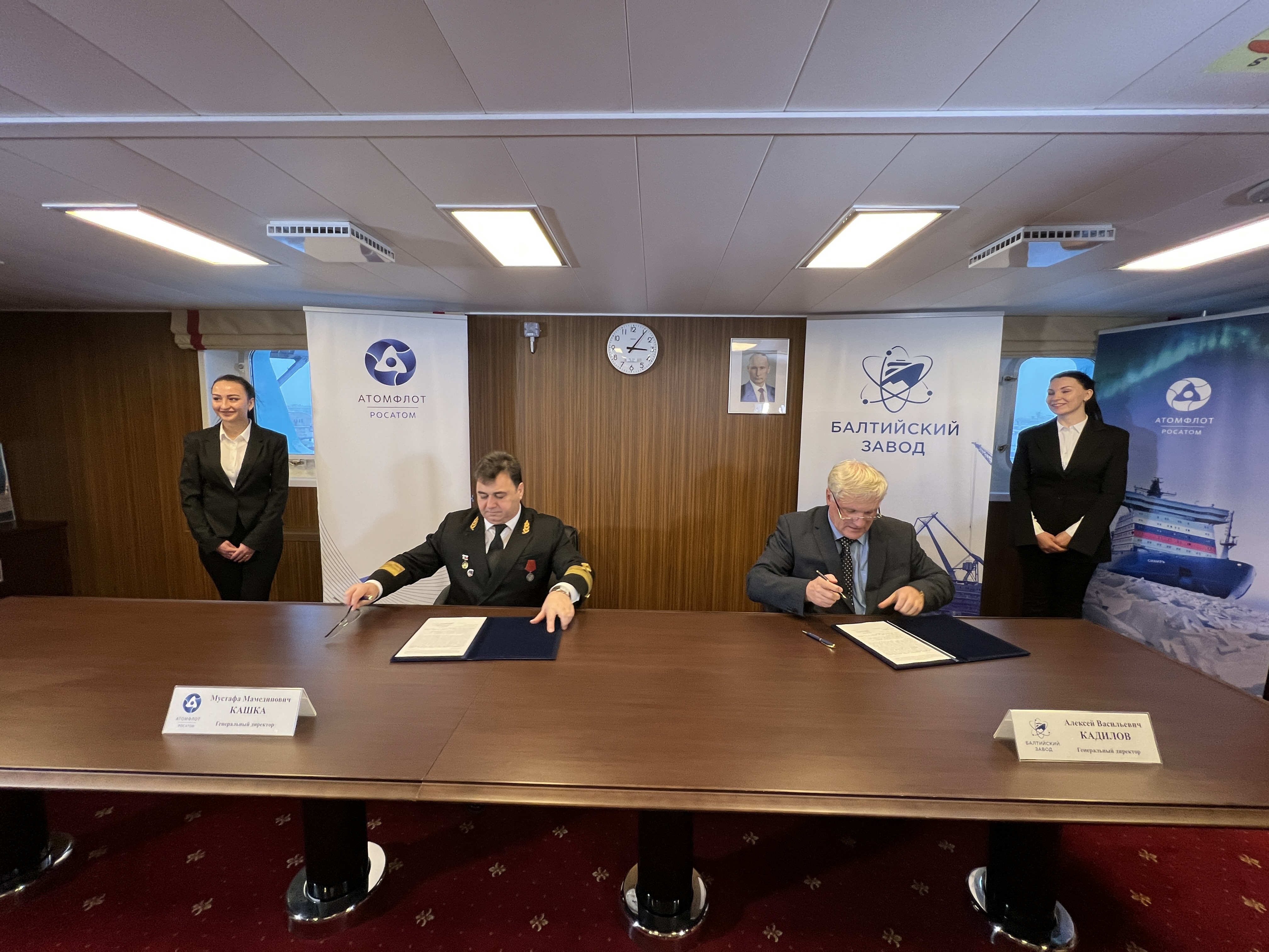 Atomflot director Mustafa Kashka (left) and director of the Baltic Shipyard Aleksey Kadilov signed the hand-over papers onboard the icebreaker on December 24. Photo: Baltic Shipyard