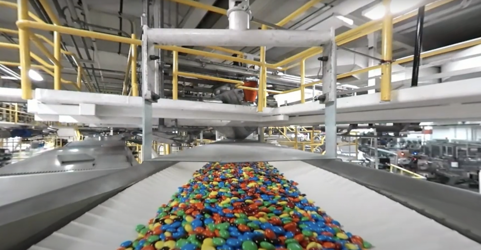 Colors including red, orange, yellow, green and blue are applied to M&M candies using a spray process, allowing Mars Inc. to evenly coat the product. After production, the product is bagged and then put into cases using robots. The cases are then palletized for distribution.