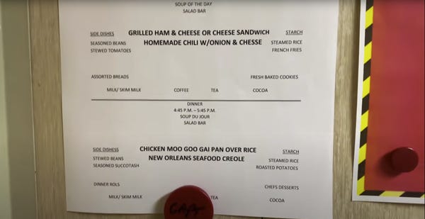 The video focuses on the officers’ mess hall. Each day, the workers are provided with a daily menu for breakfast lunch, and dinner.