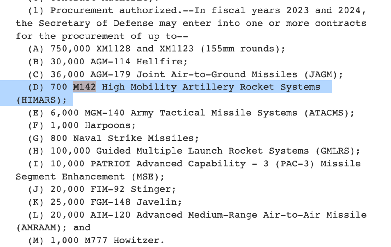 The amendment procures 6,000 ATACMS missiles, capable of striking targets at a distance of hundreds of miles, and 100,000 of the GMLRS missiles fired by the HIMARS systems in Ukraine.