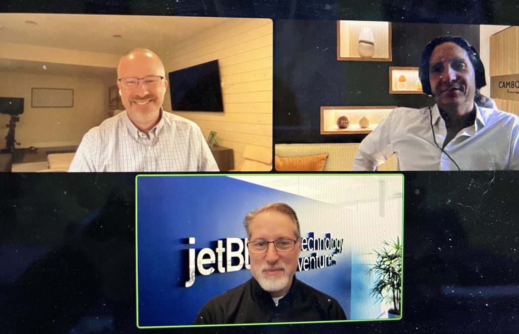 Pete Comeau, Phocuswright (top left), wrapping up the Pitch with Morgann Lesne, Cambon Partners (top right) and Steve Taub, Jetblue Technology Ventures.