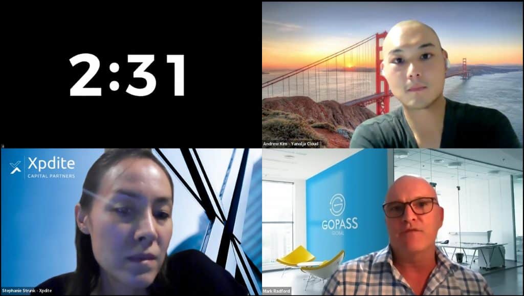 Mark Radford, CEO, GOPASS Global, talks about how his startup uses data to minimise traveller risks as judges Stephanie Strunk of Expedite Capital and Andrew Kim, Yanolja, pose questions.