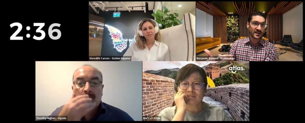Benjamin Assouied, Co-founder and CEO, Worklounge, taking questions from the judges, Timothy Hughes, Agoda; Meredith Carson, Golden Equator Group and Mary Li, Atlas.