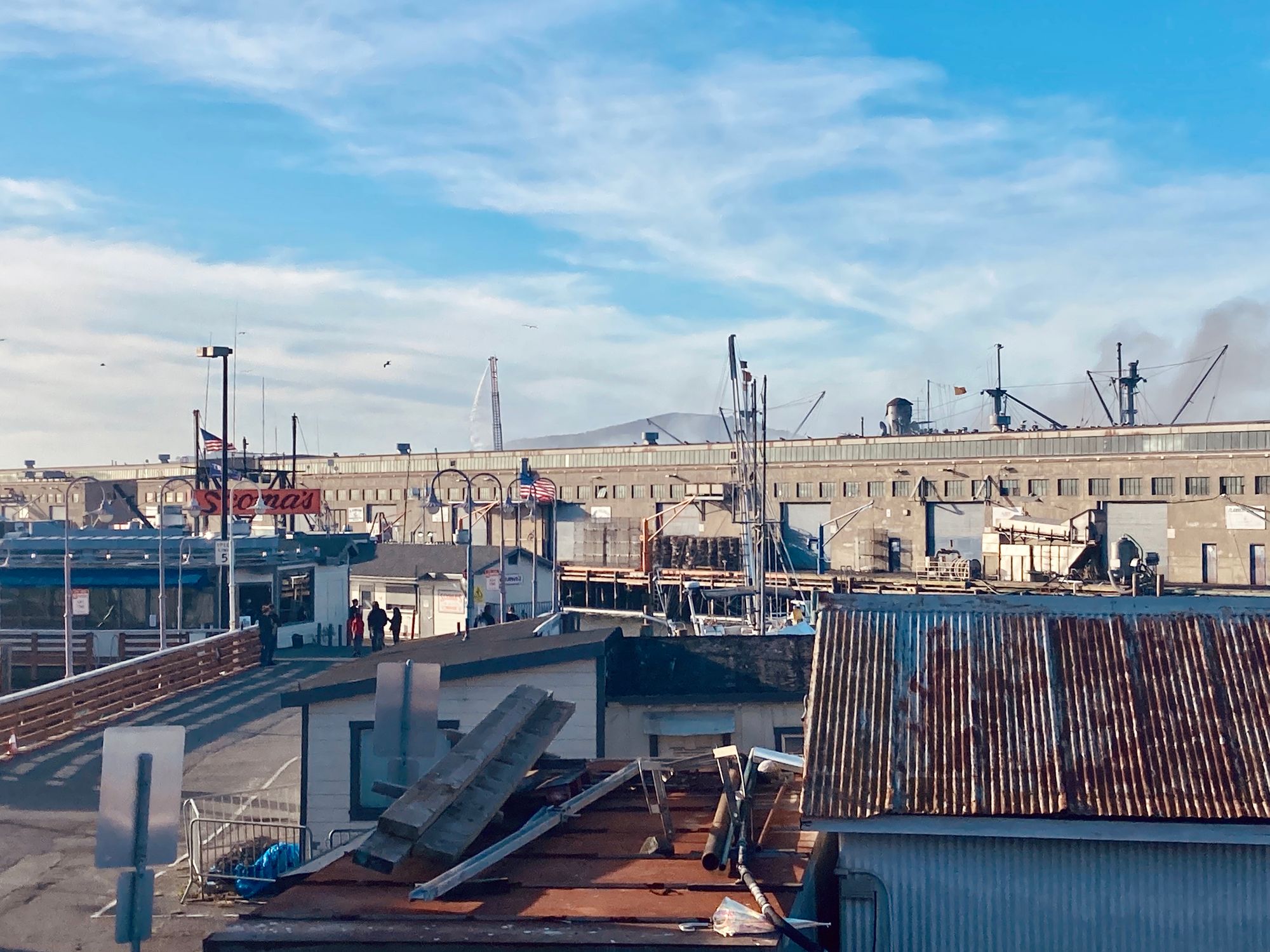 Saturday’s four-alarm fire at Pier 45 damaged a quarter of the dock’s structures, filling the clouds with smoke and blanketing nearby cars in ash. SF firefighters will continue monitoring the area for hot spots today and tomorrow, and fishing businesses are now reporting catastrophic losses.