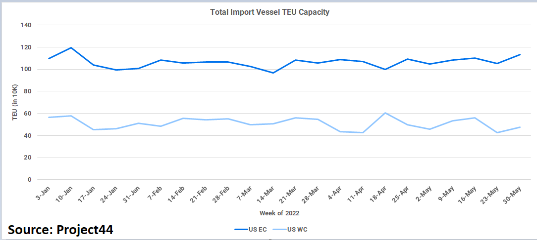 “2022 is showing us that East Coast ports are just as susceptible to congestion,” said Brian Bourke, chief growth officer of Project44.