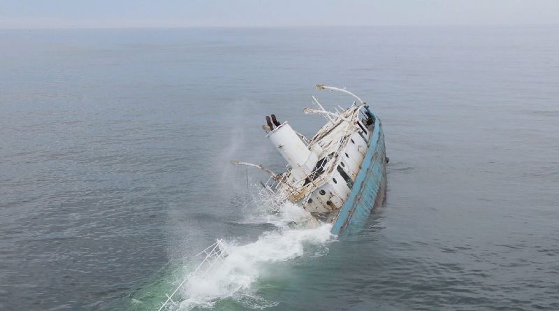 DNREC continued to broaden the recreational allure of Delaware’s renowned artificial reef system on Thursday by sinking the Reedville, originally a World War II and Korean Conflict-era coastal freighter and supply ship at a reef site 16 miles offshore and with readings of *38 40.423’N 74* 44.295’ W at a depth of 87 feet. The Reedville was converted to a commercial fishing vessel after military decommissioning and has found another new life starting at 12:18 EDT as fish habitat on the ocean floor through DNREC’s artificial reef program.