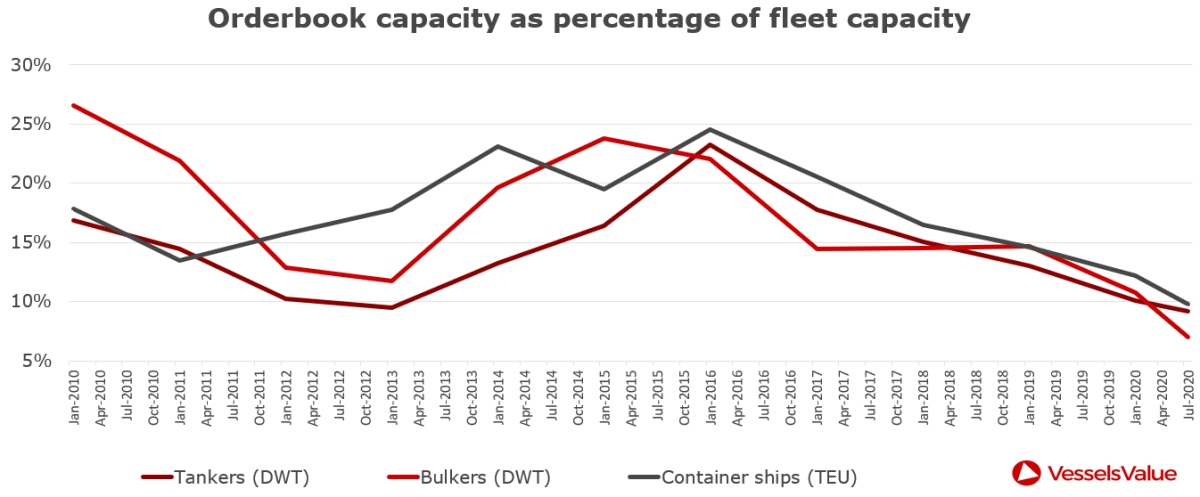New data provided to FreightWaves by U.K.-based VesselsValue confirms that 2020 is shaping up to be an exceptionally weak year for tanker, bulker and container-ship orders.