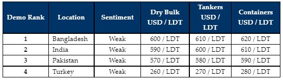 The shipbroker added that “Bangladesh once again feels the firmest market with mixed signals coming from Pakistan as to how aggressive they are for tonnage, especially as cash buyers still feel wounded from the recent round of re-negotiations, they encountered from the waterfront in Gadani and may feel hesitant to engage with the local end buyers. Pricing is very difficult to assess however as the market needs a definitive sale so that we can start to accurately guide where pricing truly lies, but with the firming freight markets in the Tanker sector over the past few weeks, it will be some time before we start to see a glut of tonnage for recyclers to feast upon”.