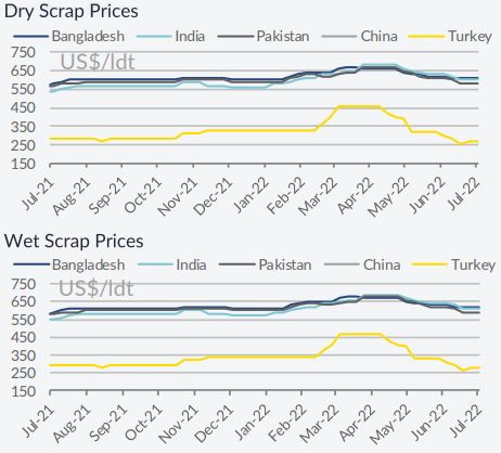 Similarly, GMS , the world’s leading cash buyer of ships said that “as we enter the traditionally quieter monsoon season, it is of little surprise to see recycling markets remaining inert and quiet, with rains / flooding hampering production at yards in Chattogram and Alang labourers returning to their hometowns as recycling activities come to a seasonal crawl. This may have inadvertently triggered the recent leveling of sub-continent steel plate prices as steel output diminishes and plate prices stabilize / firm in reaction. Although vessel prices have cooled off by USD 100/LDT in the sub-continent markets and about USD 250/MT in Turkey, global recycling sentiments remain in the doldrums given the rate of the recent declines. As such, there is no surprise to see minimal activity emanating from all markets at present, including the respective waterfronts that are displaying the shoddy state of current affairs.