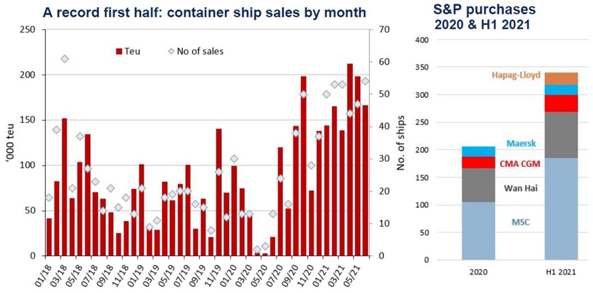 This dynamic should add even more fuel to the fire in the S&P market. Container-ship values “have been skyrocketing from April onwards,” said Alphaliner, noting that a 1,700-TEU ship was sold in June for $21.5 million, triple what this size of ship fetched in January.