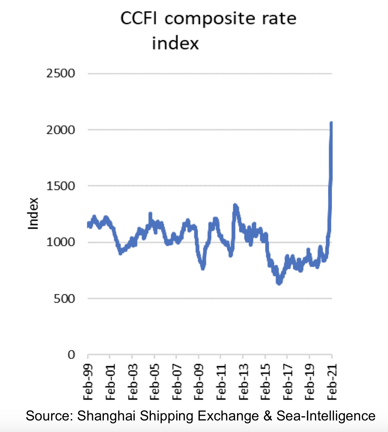 “The developments in late 2020 and early 2021 can only be described as extreme. For all intents and purposes, the best description is that contract rates measured by the CCFI index are almost twice what they have ever been before. This is an extreme record seen in a 23-year perspective,” Sea-Intelligence stated.