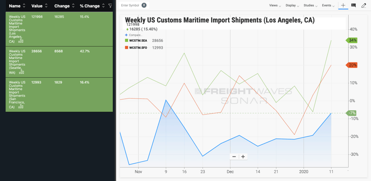 Shipments coming into West Coast ports are also picking up steam going into the Lunar New Year. Weekly import shipments coming into Los Angeles are up 15% through Jan. 11 (SONAR: WCSTM.LAX). Seattle and Oakland ports are seeing gains of 43% and 16%, respectively, through the same period of time (SONAR: WCSTM.SEA, WCSTM.SFO).