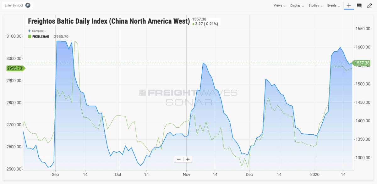 Spot ocean freight on the main Asia-U.S. West Coast trade lane is running $1,557 per forty-foot equivalent unit (FEU) according to the Freightos Baltic Daily Index (SONAR: FBXD.CNAW). While down from a mid-January high of $1,600 per FEU, the index is at one of its best levels since October.