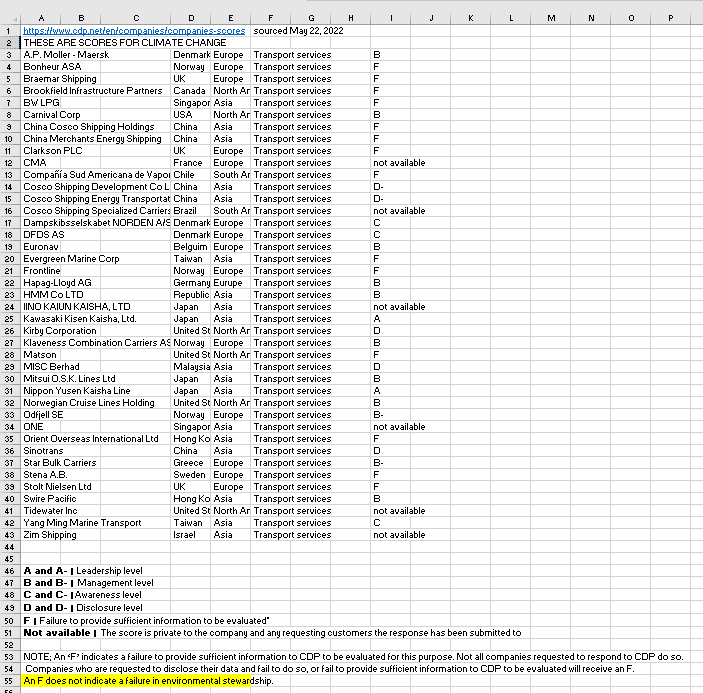 The CDP report (which I found through a McKinsey publication regarding the upcoming Davos 2022 meetings) rates hundreds of companies across multiple parameters, and the online data can be grouped by industry categories (again, see here). In the different sectors related to “Transport”, the table below shows the scores that I found for maritime companies. Before getting too excited about the various “F” ratings- CDP indicates that an “F” refers to a failure to provide data fitting into the CDP algorithms.