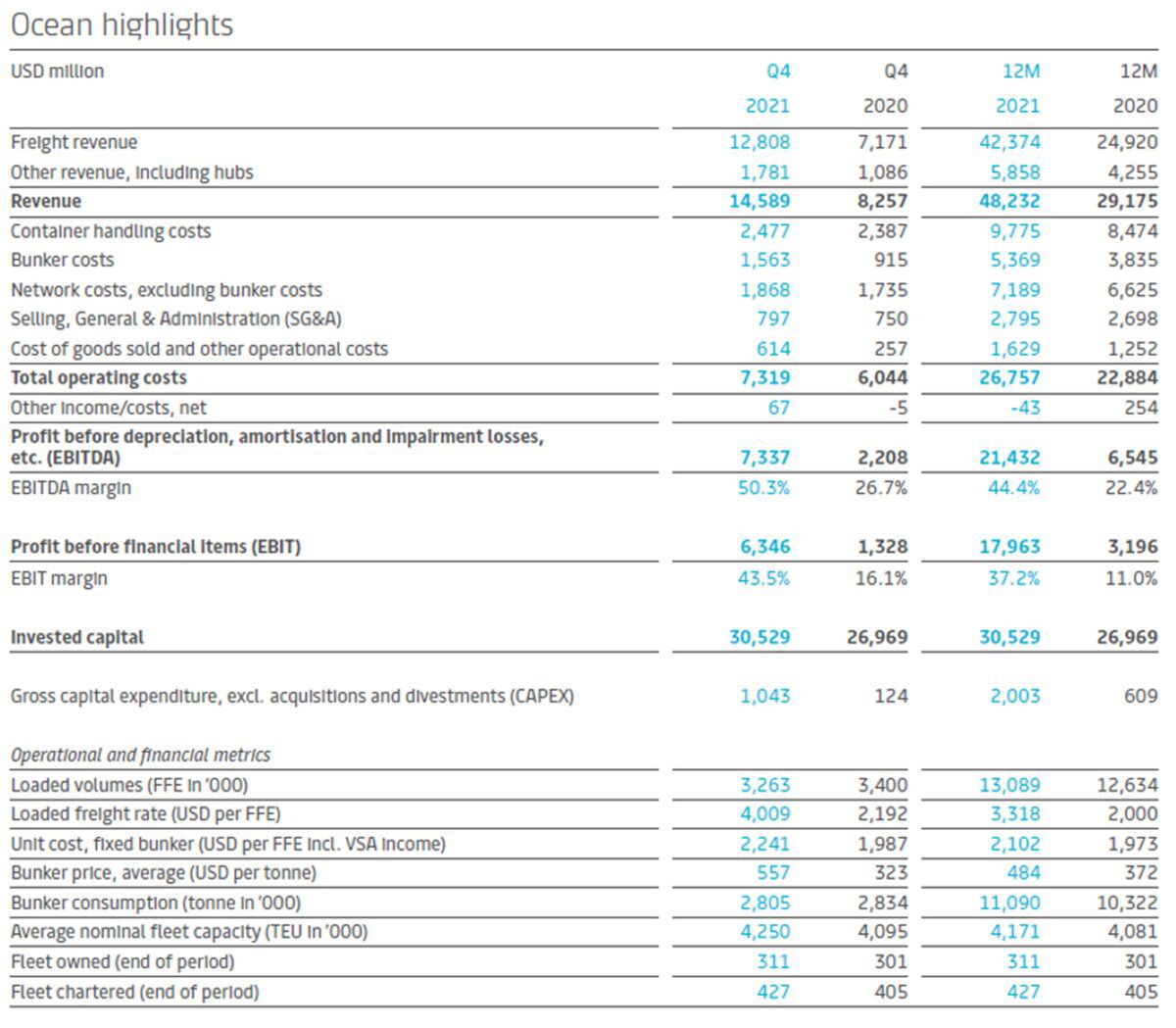 On Wednesday, Maersk announced 2022 EBITDA guidance of $24 billion, i.e., flat versus 2021. The consensus was for $24.4 billion, with one big outlier: Deutsche Bank’s Andy Chu predicting Maersk 2022 EBITDA of $34.1 billion.