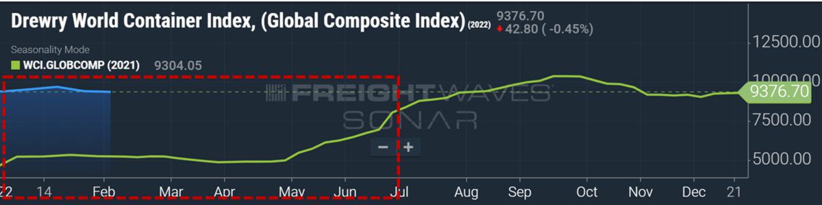 Global average spot rate in $ per FEU. Red dotted line suggests easy comps in first half. Chart: FreightWaves SONAR (To learn more about FreightWaves SONAR, click here.)