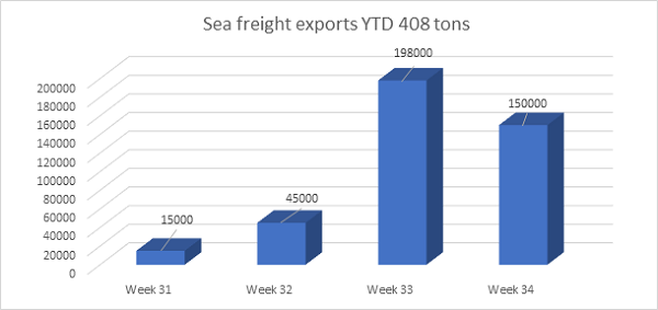 Year-to-date sea freight blueberry exports this year; air freight exports YTD week 34 stood at 124 tonnes (source: Berries ZA)