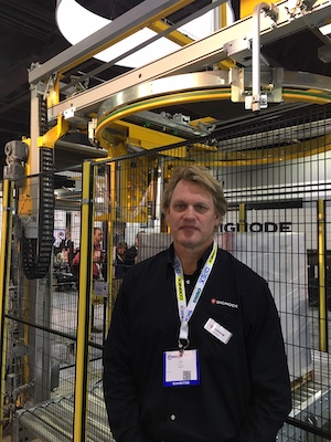 During a booth visit, Don Overberg, director of strategic accounts, automation solutions for Signode, explained how Storfast, a cart-based AS/RS with software for managing the storage, and the Octopus ring wrapper can be combined to create a highly space and labor efficient material flow.