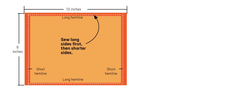Stack the two rectangles; you will sew the mask as if it was a single piece of fabric. Fold over the long sides ¼ inch and hem. Then fold the double layer of fabric over ½ inch along the short sides and stitch down.