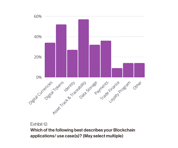 When asked about the various applications of blockchain technology, 52% of respondents identified asset tracking and traceability — more than any other use case. Among those who made this selection, 52% also identified trade finance as a major use case. Thirty percent of respondents selected four or more applications, an indication that blockchain use cases are interrelated.
