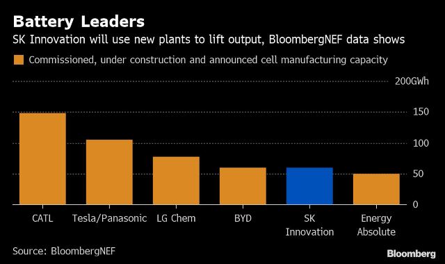 The chart prepared by Bloomberg shows the position of SK Innovation in the global EV battery market.