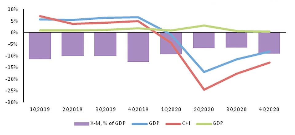 Gross domestic product (GDP) contracted 9.5% last year, with the 15% fall in consumption and investments only partly offset by government spending and a significant narrowing of the trade deficit, itself a reflection of the demand collapse. Quarterly data show that as lockdown measures were gradually relaxed and mobility increased, there was a rebound in activity in Q3, in part reflecting pent-up demand, that softened in Q4. The gains notwithstanding, the level of Q4 2020 output was still 8% lower than Q4 2019. Expectations now of sustaining growth hinge on keeping infections down even as quarantine restrictions are progressively loosened.