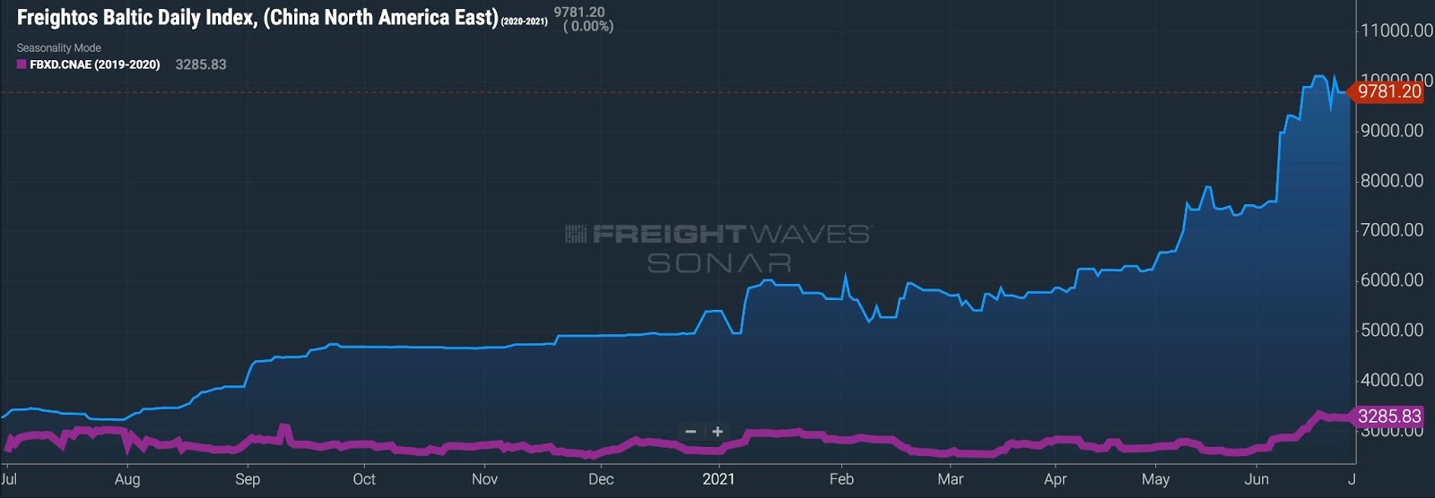 On June 15, the Freightos Baltic Index daily assessment for Asia-East Coast reached an all-time high of $10,104 per forty-foot equivalent unit. As of Thursday, it was at $9,781 per FEU assessment, up 198% year on year.
