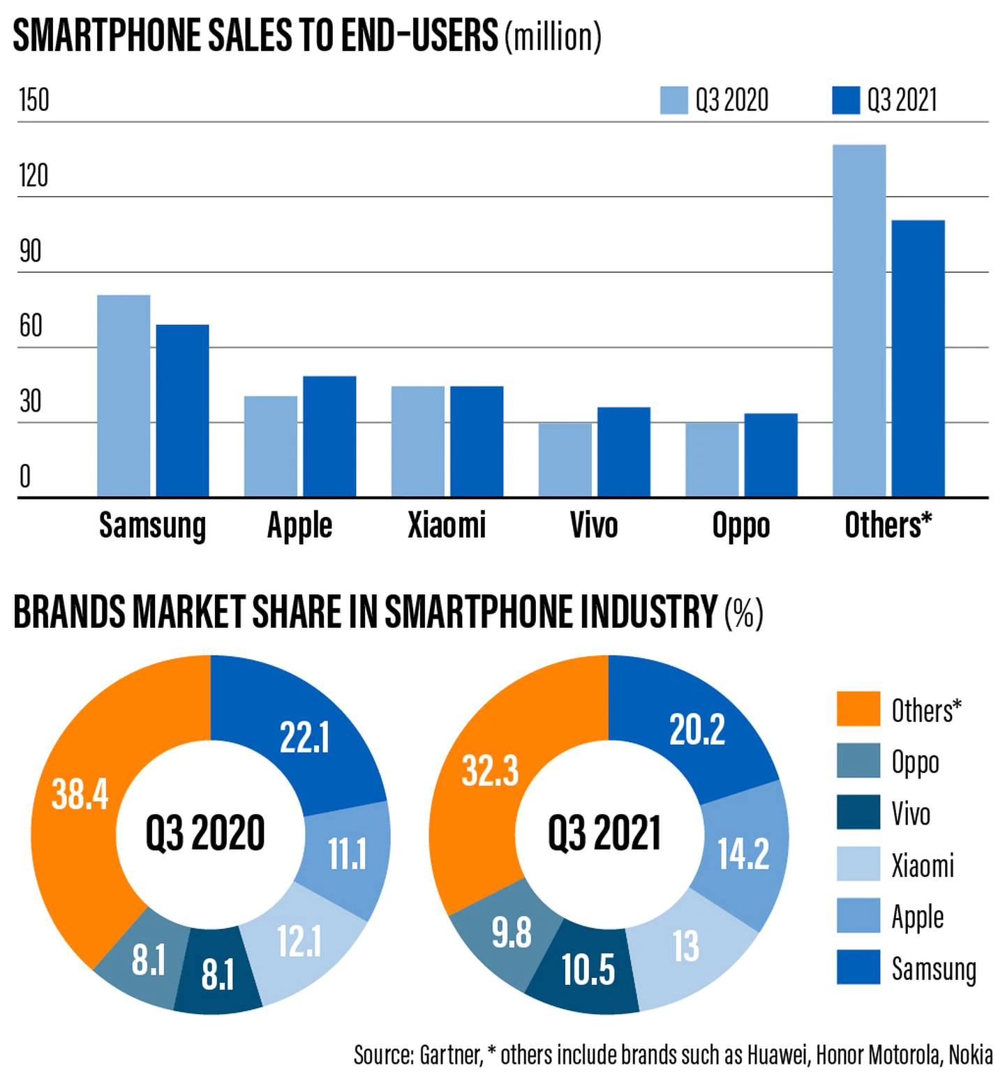 The South Korean brand sold more than 69 million smartphones in the third quarter, grabbing a market share of 20.2 per cent. Its sales declined more than 14.6 per cent on an annual basis.