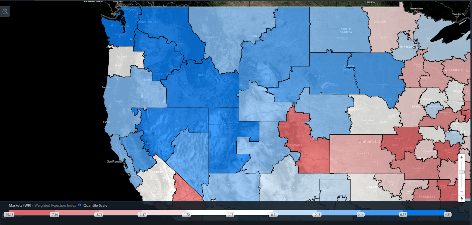 FreightWaves SONAR data shows that, in most freight markets in the Northwest region, capacity has become tighter than the rest of the country. This is indicated by the blue shading on the map below, showing the weighted rejection index (WRI). WRI is a combination of market share – a market’s outbound volume compared to the rest of the country – and weekly change in tender rejection rate – the percentage of electronically offered loads from shippers that have been turned down by carriers for any number of reasons.