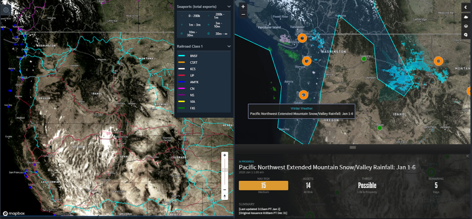 Air cargo could be delayed at times at Seattle-Tacoma International (ICAO code: SEA) and Portland International (ICAO code: PDX) airports. Operations at the ports of Seattle, Tacoma and Portland will be interrupted intermittently, as will several oil/petroleum facilities and railroads in the region. The storms may also make it difficult to load/unload freight at intermodal ramps. Based on the anticipated level of disruption, the assets at risk are color coded in SONAR Critical Events.