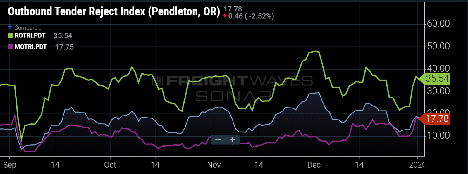 While much of the country is stabilizing this week, the Pacific Northwest remains unsettled. FreightWaves SONAR data shows outbound rejection rates are up week-over-week in the Spokane (OTRI.GEG), Twin Falls (OTRI.TWF) and Pendleton (OTRI.PDT) markets, primarily due to a reefer shortage. Outbound rejections represent the percentage of electronically offered loads from shippers that are turned down by carriers for various reasons. Reefers are climate-controlled 53-foot trailers.