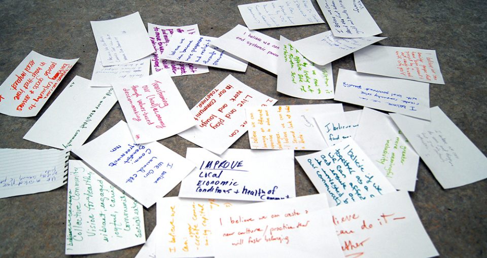 Lead photo shows possibility cards from a recent community conversation on social procurement led by David LePage of Buy Social Canada. Photo by Yvonne Hollandy.