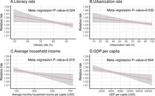 After adjusting for city-level mean temperature, temperature range, and population structure in meta-regression, the city-specific RRs were still negatively associated with literacy rate (meta-regression P value = 0.024), urbanization rate (meta-regression P value = 0.033), average family income (meta-regression P value = 0.015), and log(GDP per capita) (meta-regression P value = 0.004) (Fig 5). The modifying effects of the 4 socioeconomic indicators on city-specific heat–hospitalization association changed minimally after excluding cities with population sizes larger than the 95th percentile of the 1,814 cities (Figs G and H in S2 Text).