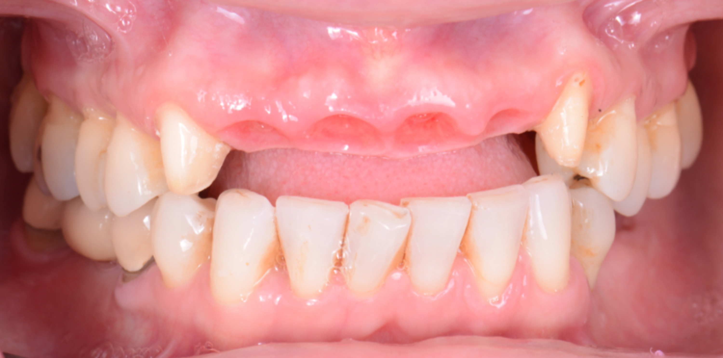 A 45-years-old female patient presented to the clinic with the chief complaint, “My front crowns are loose, and they come off sometimes”. The patient reported that she had crowns made of porcelain fused to metal placed on teeth from the maxillary right lateral incisor to the left incisor fifteen years ago (Figures 1). These crowns became loose and came off sometimes, which she previously cemented back on with an over-the-counter remedy from the pharmacy. The interdental papilla was reduced in height, forming a black triangle between anterior teeth.