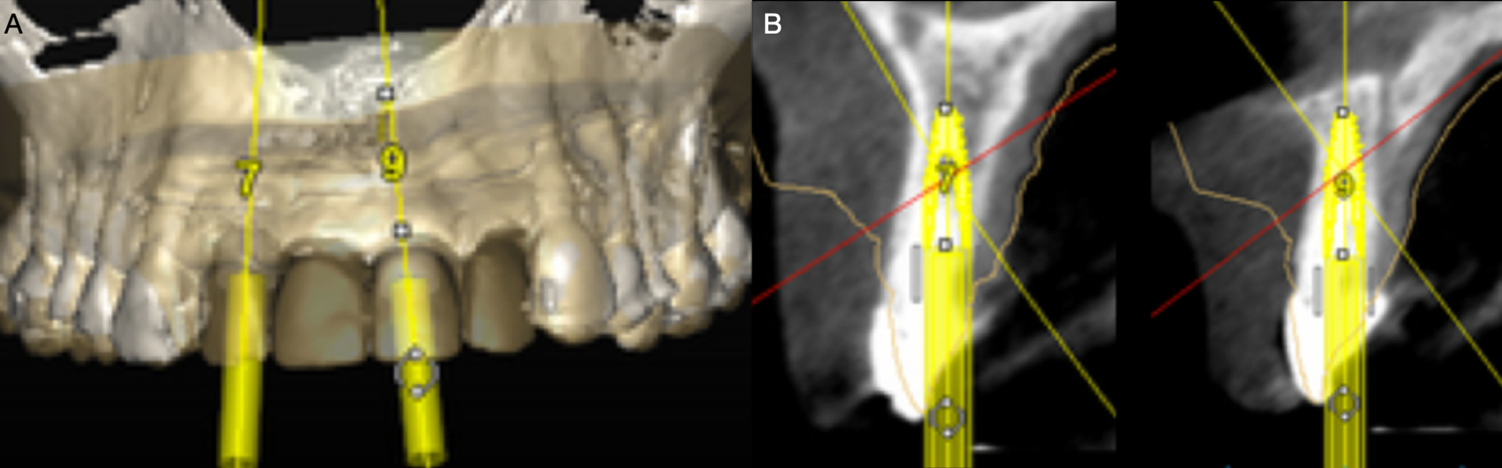 The existing restorations of the maxillary incisors were removed, and secondary caries were found in all teeth. A fractured core was observed on the maxillary left central incisor with grade II mobility on all teeth (Figures 2B, 2C). Therefore, these teeth were deemed hopeless. The patient was presented with the option of having two implants placed to support a fixed prosthesis from the maxillary left lateral incisor to maxillary right lateral incisors and single restorations on the maxillary right and left canines. The patient approved the plan, and the treatment was initiated.