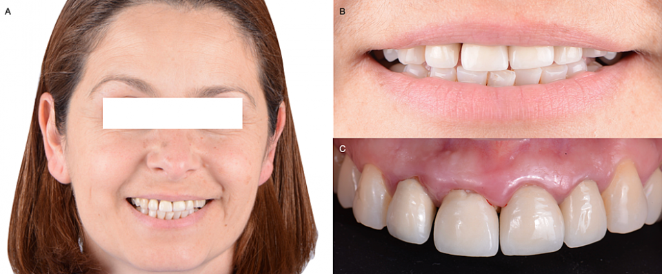 After a detailed clinical evaluation, the maxillary right lateral incisor, central incisor, and maxillary left lateral incisor were diagnosed with mobility grade II. Incisal wear was found on the maxillary right and left canines. Radiographic evaluation showed the old crowns and metal posts on the maxillary left lateral incisor, central incisor, and right lateral incisor (Figure 2A). The patient had high esthetic demands and showed interest in having fixed all-ceramic restorations from the right maxillary canine to the left canine. Fortunately, the patient had a low smile line, and gingival inflammation and disharmony were not showing while smiling. The patient was informed of the need to remove the old crowns to re-assess the teeth’ clinical situation and agreed to the procedure.