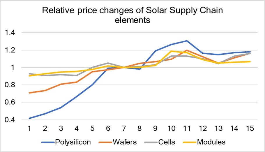 If we normalize all of these figures to their respective values in July, we can see how the different supply chain elements have reacted to polysilicon price changes – and logically enough you can see that the polysilicon price changes in a given month take one or two months to percolate through to module prices. Whether module manufacturers will lower their prices so rapidly as polysilicon prices return to normality in 2023 is another matter – they will probably not have the luxury of doing so, but they may feel they have to regain some losses incurred from the upstream segment, which would add a few months’ delay.