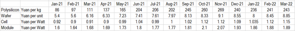 Now is as good a time as any to examine the past year’s prices in each segment of the solar supply chain, to see how costs have been passed onto wafers, cells, and modules. The following data is compiled from a mixture of Chinese sources and covers 210mm wafers, cells and modules.