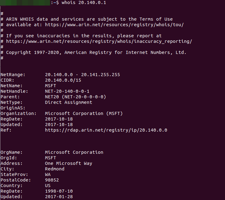 - A WHOIS lookup on the IP address (20.140.0.1).
